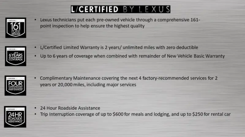 Enjoy our Connected Services trial offerings when you purchase select L/Certified vehicles. Depending on the vehicle, model year, and vehicle certification date, the trial may include Enform Remote/Remote Connect, Safety Connect, Service Connect, and/or Destination Assist. To learn more about Connected Services, contact your nearest Lexus dealership or visit our Resources page.
